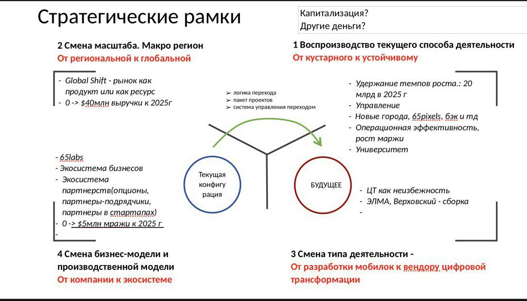 Я презентовал свое видение 65apps на горизонте 10-15 лет. В течение трех дней нам нужно было проанализировать этот замысел, согласиться/скорректировать его и сформировать проекты перехода от ситуации «as is» к «to be» и систему управления этим переходом.