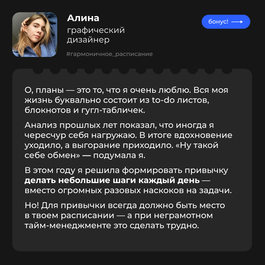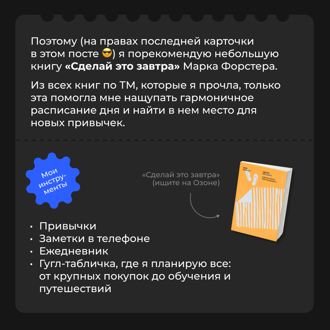 | | | Возможно, вы возьмете себе некоторые инструменты и измените подход, а может все оставить как есть. Главное — наслаждаться процессом и жить полной жизнью.