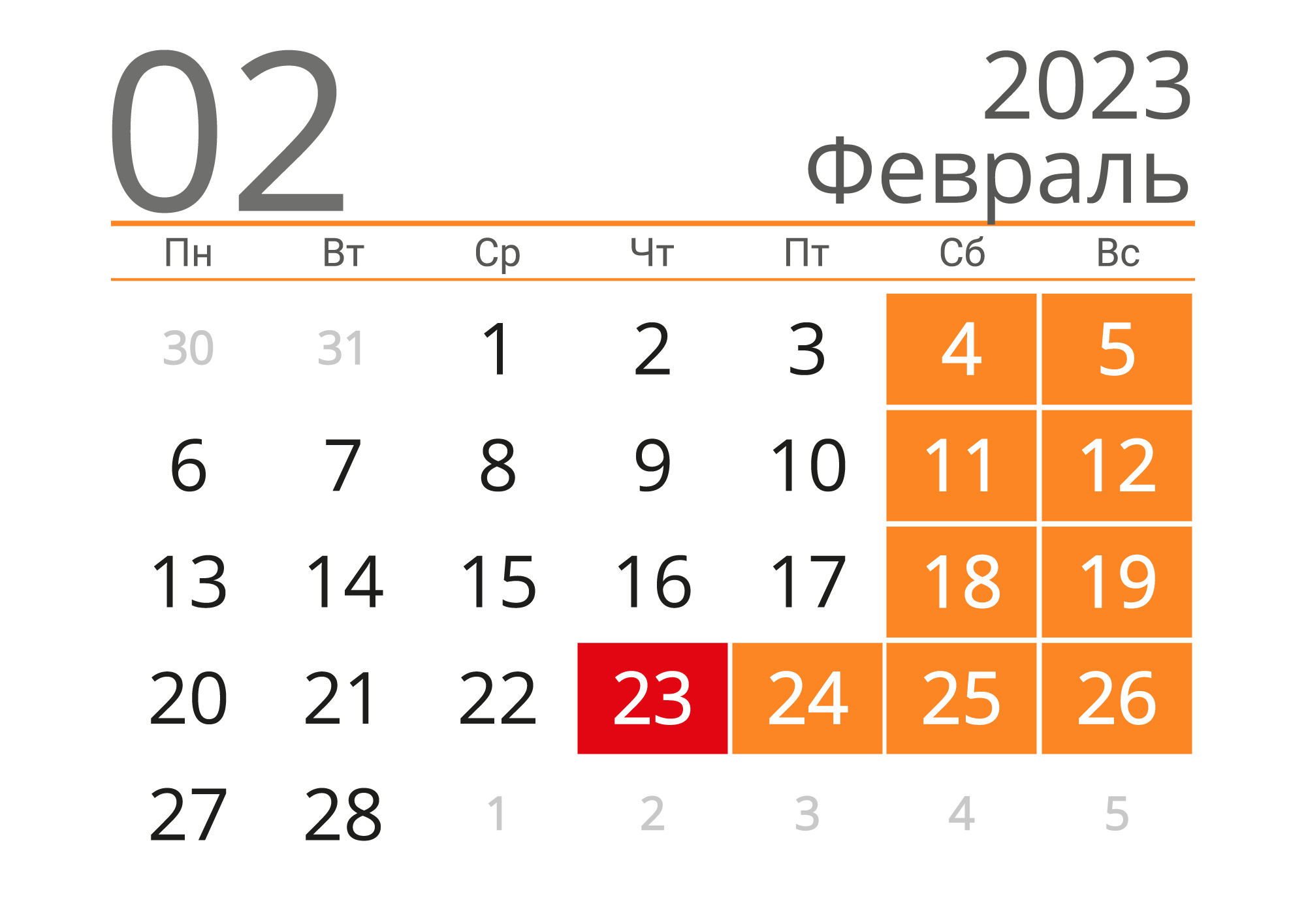 Производственный календарь (уже даже не астрологи) говорит нам, как мы будем работать в феврале. Как мы видим, к концу февраля нас ждет четыре дня выходных и праздников. С 23 по 26 февраля можно отправиться в отпуск в соседний город, рвануть на пару деньков в горы, устроить сериальный марафон и в целом делать то, что нравится.