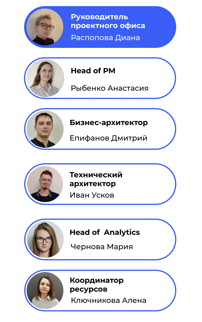 Сейчас в ПО есть четыре роли: РМО (Диана), Head of PM (Настя Рыбенко), Бизнес-архитектор (Дмитрий Епифанов) и Координатор ресурсов (Алена Ключникова).
